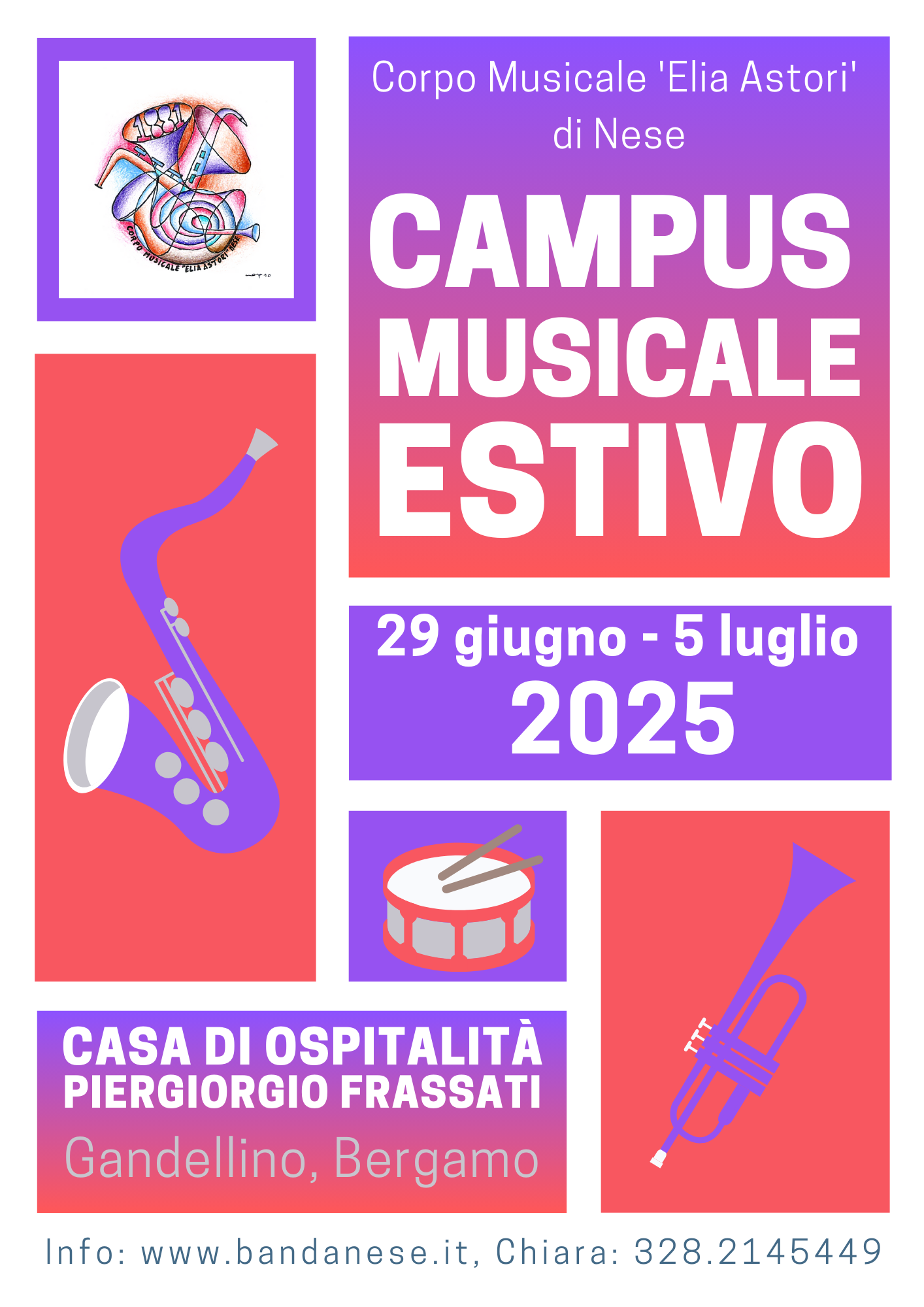 Il Campus Musicale Estivo 2025 si svolgerà dal 29 giugno al 5 luglio presso la Casa di Ospitalità Piergiorgio Frassati a Gandellino (Bergamo). Il campus è aperto agli allievi di strumento a fiato e a percussione, di pianoforte, chitarra e canto che abbiano intrapreso gli studi musicali presso un corso bandistico o una scuola ad indirizzo musicale da almeno un anno, dai 9 anni di età in poi. Il campus si pone l'obiettivo di dare continuità alla prassi musicale e allo studio dello strumento anche durante il periodo estivo, attraverso momenti di approfondimento individuale, di gruppo e con la proposta di diverse attività legate alla musica. Sono altresì importanti il fine della condivisione e lo sviluppo delle competenze sociali e dell'autonomia.